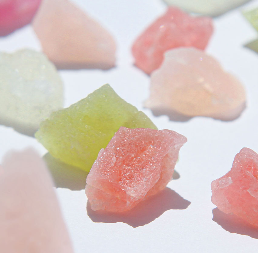 琥珀糖は砂糖と寒天を用いた、宝石のように輝く日本の伝統的なお菓子です。鮮やかな彩りと繊細な味わいを持つ逸品は、ひとつひとつ丁寧な手仕事によって生み出されます。